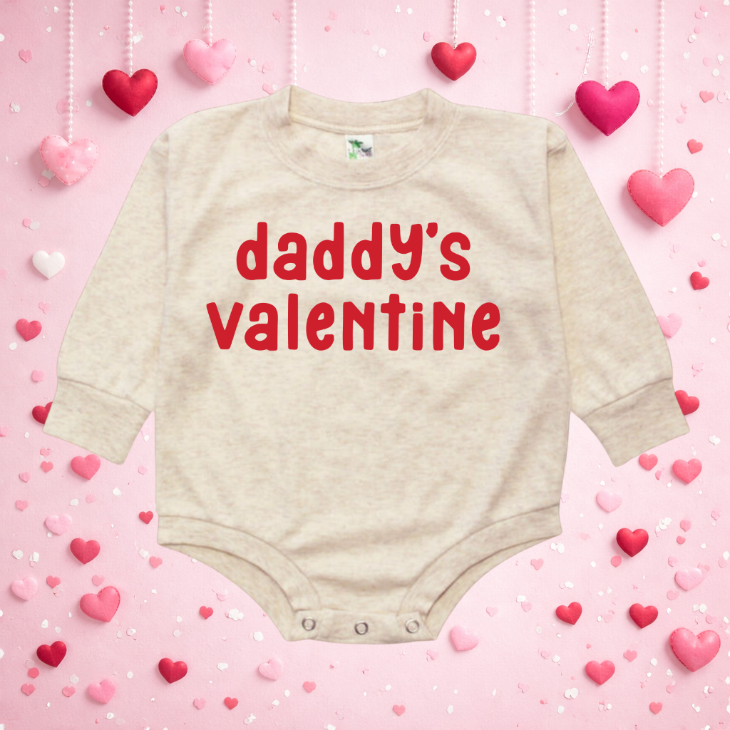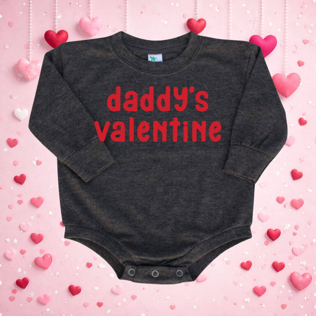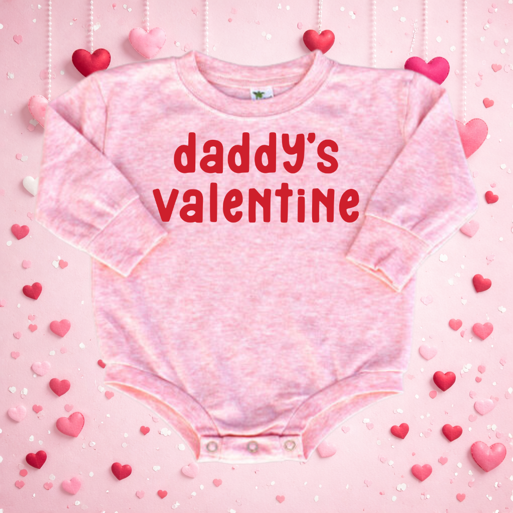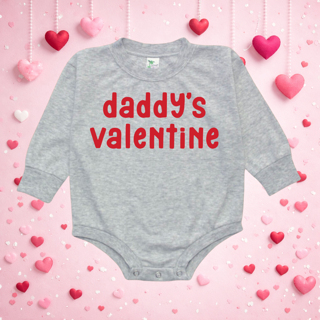 Make Valentine’s Day extra special with our Daddy’s Valentine Bubble Romper – the perfect infant bodysuit for dad’s favorite little valentine. Made from soft, breathable cotton with snap closures for quick and easy diaper changes, this comfy onesie is ideal for Valentine’s Day photos, cozy snuggles, or gifting to a proud dad. Featuring a sweet “Daddy’s Valentine” design, it’s a must-have outfit for baby’s first Valentine’s Day.