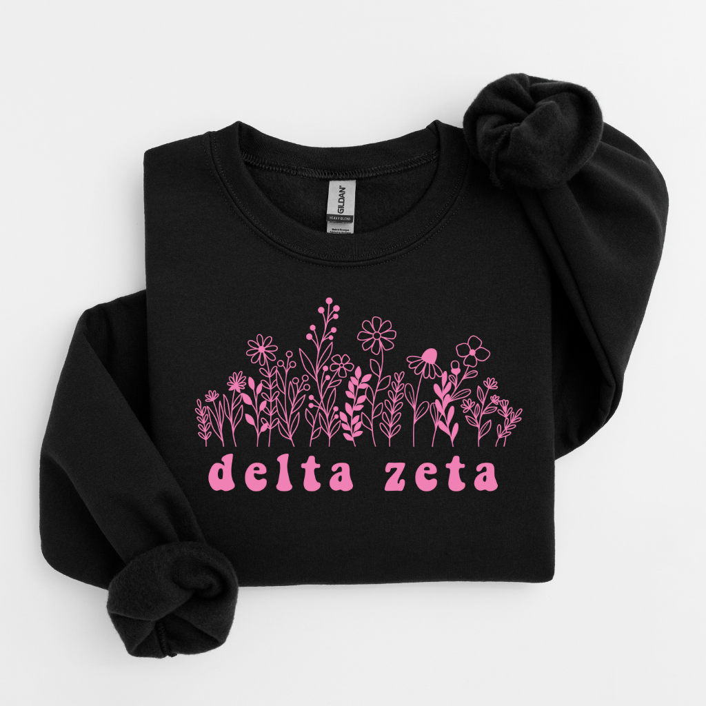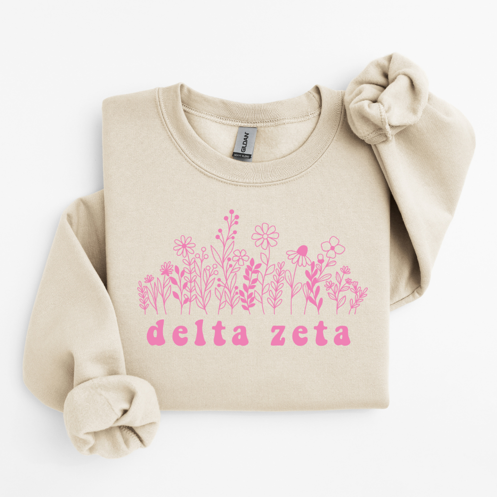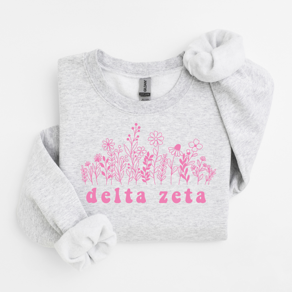 Add a fresh floral touch to your Greek wardrobe with our Delta Zeta Pink Flowers Sweater – the perfect blend of cozy comfort and pretty, feminine style. Made with soft, mid-weight fleece and a relaxed unisex fit, this sorority crewneck features delicate pink floral artwork paired with Delta Zeta lettering for a timeless yet trendy look. Perfect for bid day, big/little reveal, chapter events, campus days, or coffee runs with your sisters, this sweater is an easy favorite for every DZ closet.