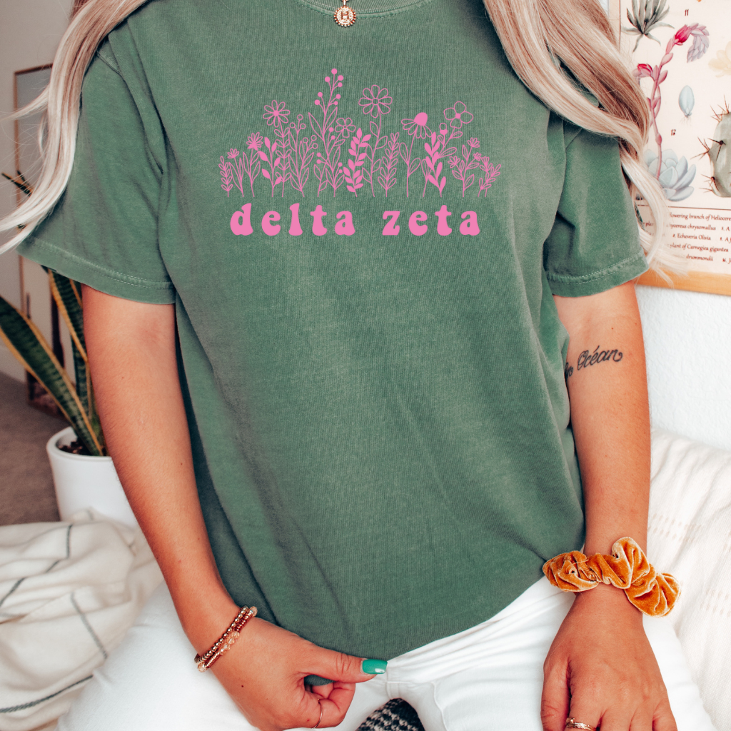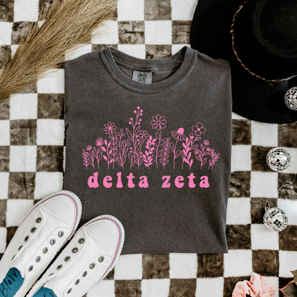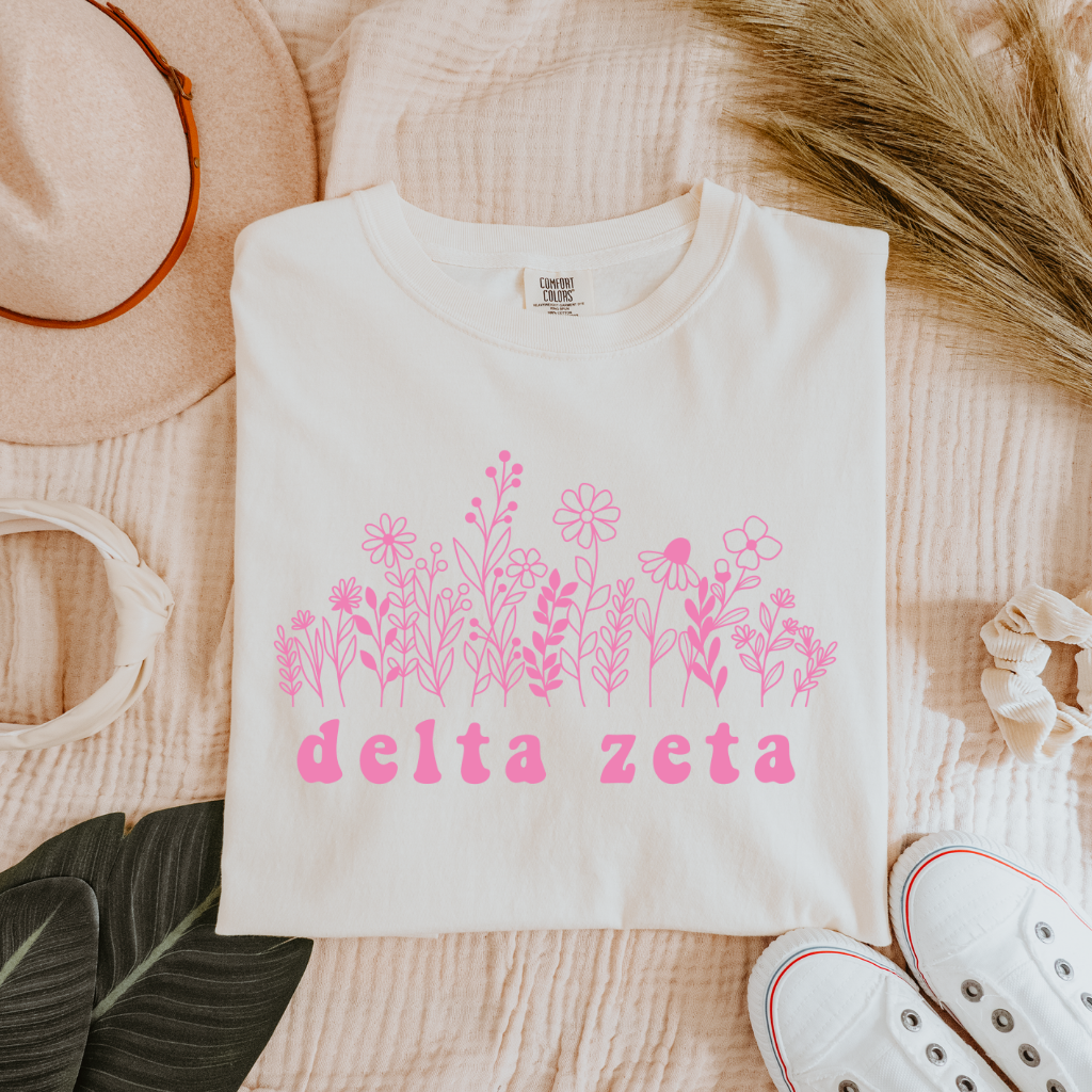 Add a pretty floral touch to your Greek wardrobe with our Delta Zeta Pink Flowers T-Shirt – the perfect blend of sweet style and everyday comfort. Made from soft, breathable cotton with a relaxed unisex fit, this tee features delicate pink floral artwork paired with Delta Zeta lettering for a feminine, timeless look. Perfect for bid day, big/little reveal, chapter events, or casual campus days, this sorority t-shirt is an easy favorite for every DZ sister or alumna.