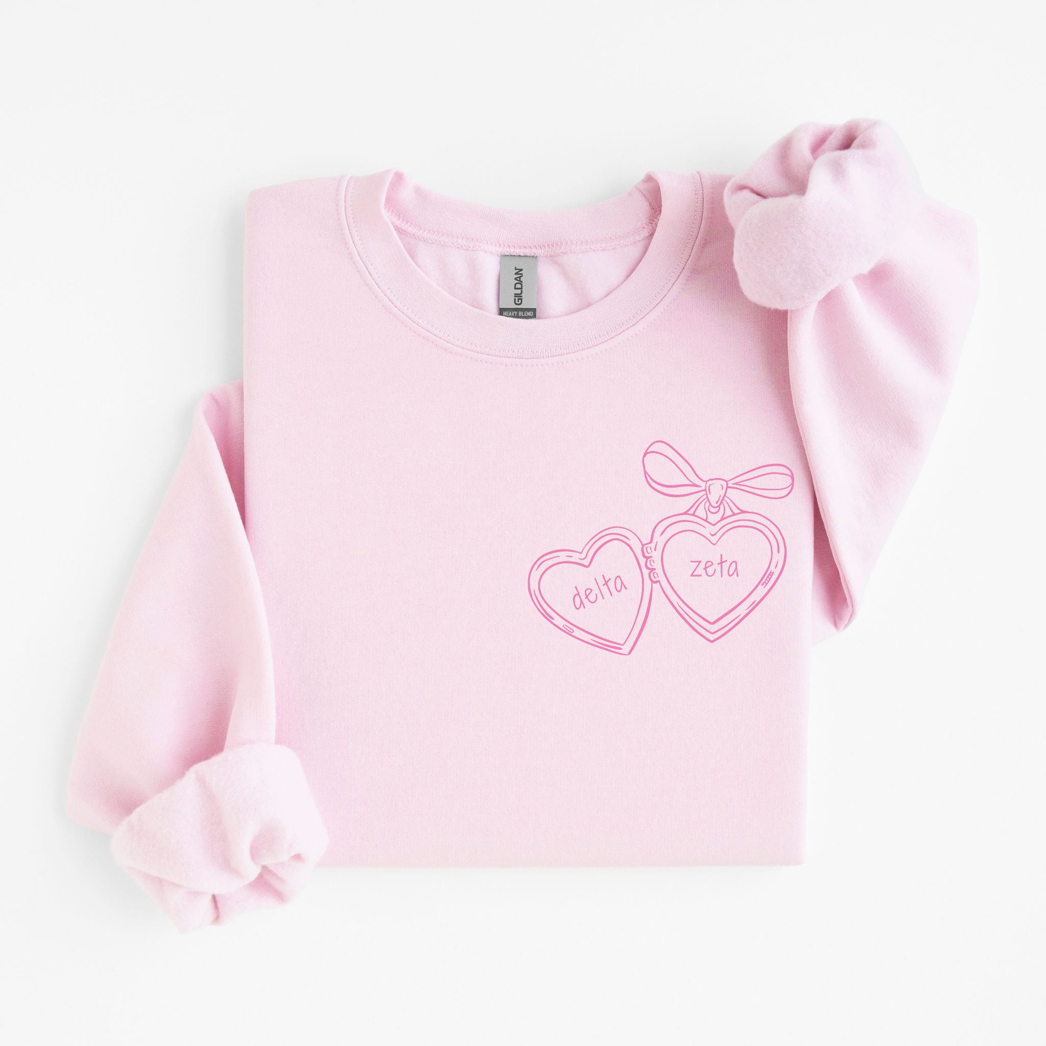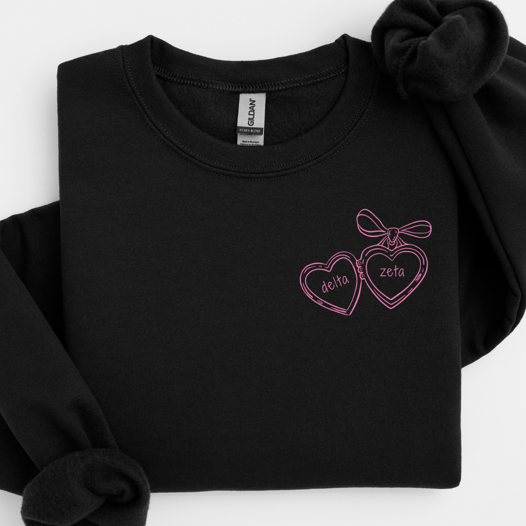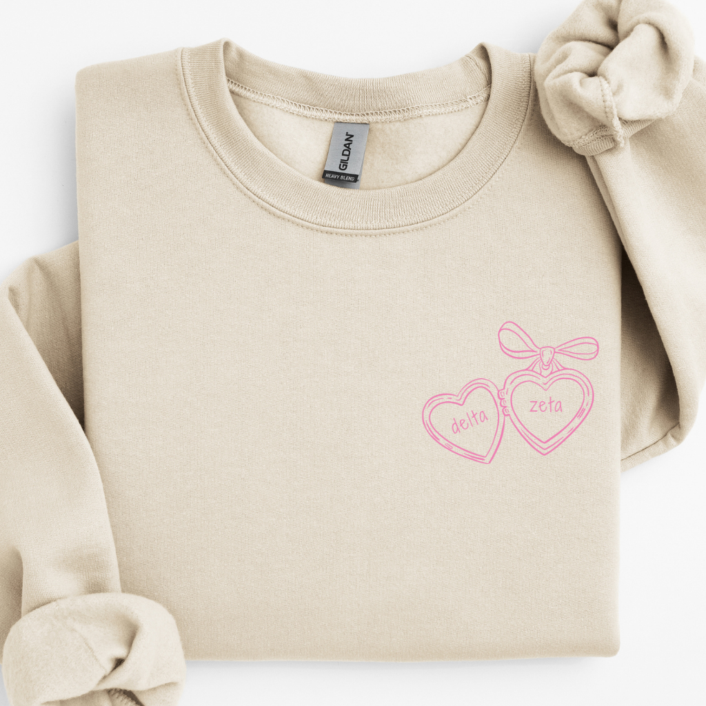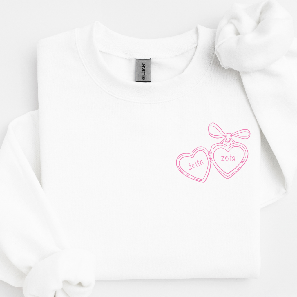 Fall in love with your sorority style in our Delta Zeta Pink Heart Locket Sweater – a sweet blend of feminine charm and everyday comfort. Made with soft, mid-weight fleece and a relaxed unisex fit, this sorority crewneck features a dreamy pink heart locket graphic paired with Delta Zeta lettering for a soft, vintage-inspired look. Perfect for bid day, big/little reveal, chapter events, or casual campus days, this sweater is a beautiful staple for every DZ sister who loves a romantic aesthetic.