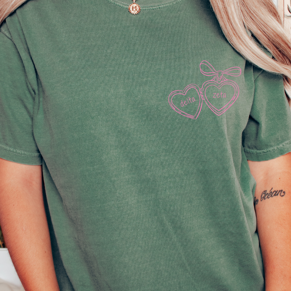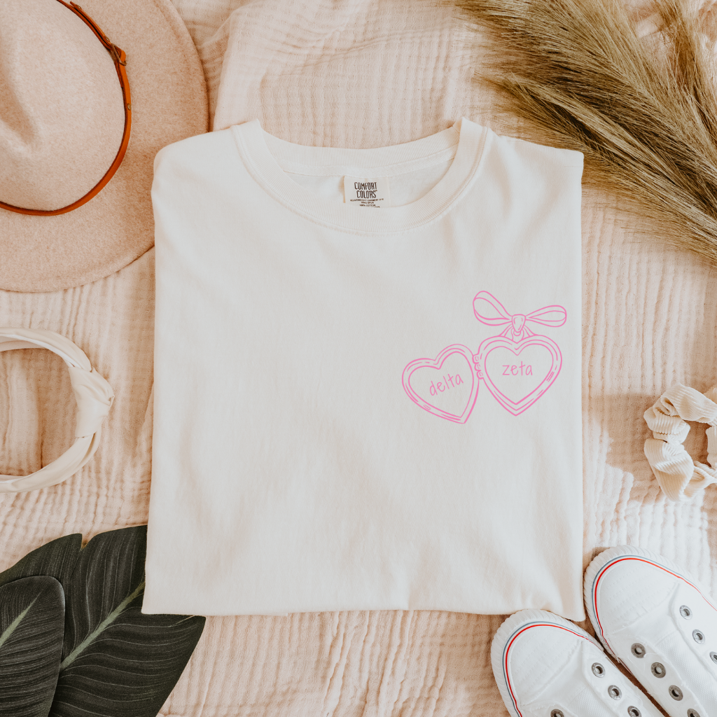 Fall in love with your sorority style in our Delta Zeta Pink Heart Locket T-Shirt – a sweet blend of feminine charm and everyday comfort. Made from soft, breathable cotton with a relaxed unisex fit, this tee features a dreamy pink heart locket graphic paired with Delta Zeta lettering for a soft, vintage-inspired look. Perfect for bid day, big/little reveal, chapter events, or casual campus days, this sorority t-shirt is a beautiful staple for every DZ sister who loves a romantic aesthetic.