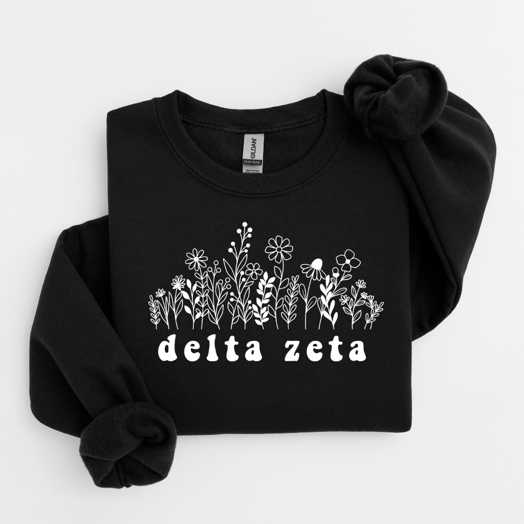 Add a fresh, floral touch to your Greek wardrobe with our Delta Zeta White Flowers Sweater – the perfect blend of cozy comfort and feminine charm. Made with soft, mid-weight fleece and a relaxed unisex fit, this sorority crewneck features delicate white floral artwork paired with Delta Zeta lettering for a timeless, elevated look. Ideal for bid day, big/little reveal, chapter events, game days, or everyday campus wear, this sweater is a must-have staple for every DZ sister or alumna.